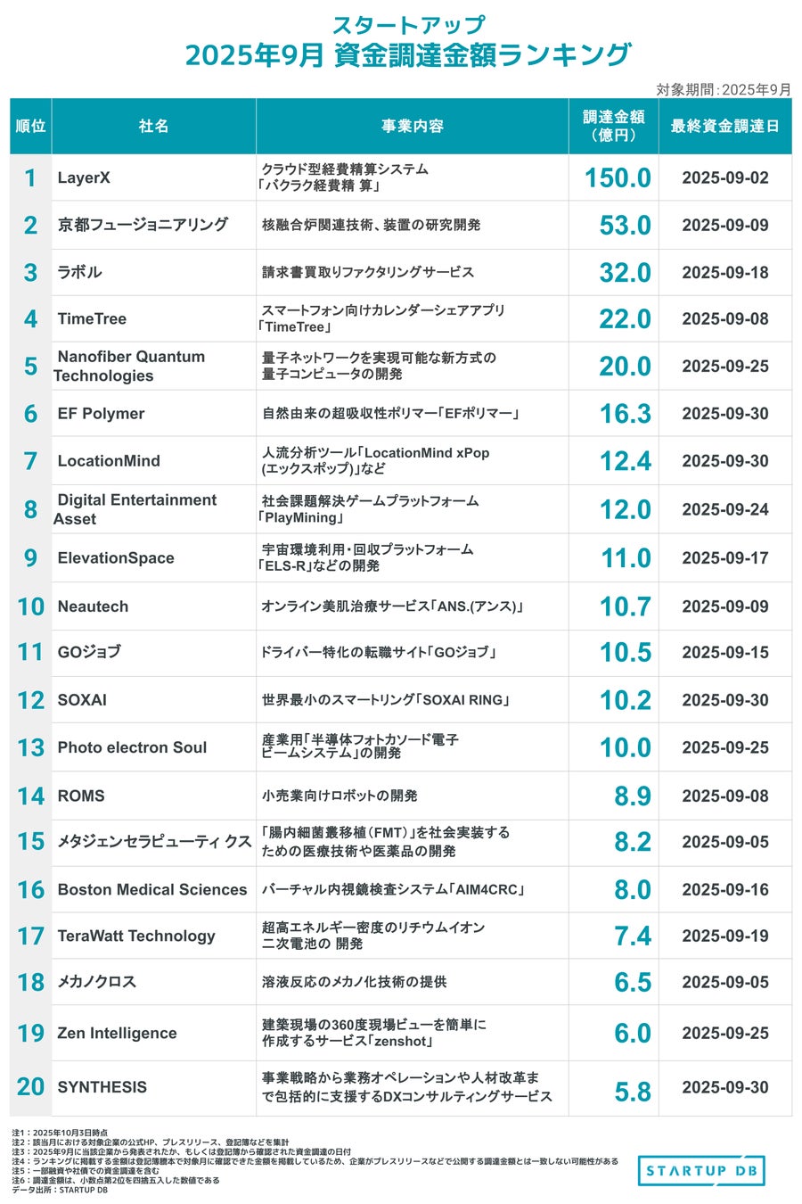 ※9月の資金調達額の合計をランキング形式で並べました。原則的に登記簿から取得した調達日を優先しており、次点でプレスリリースなどの公式発表も集計しています。