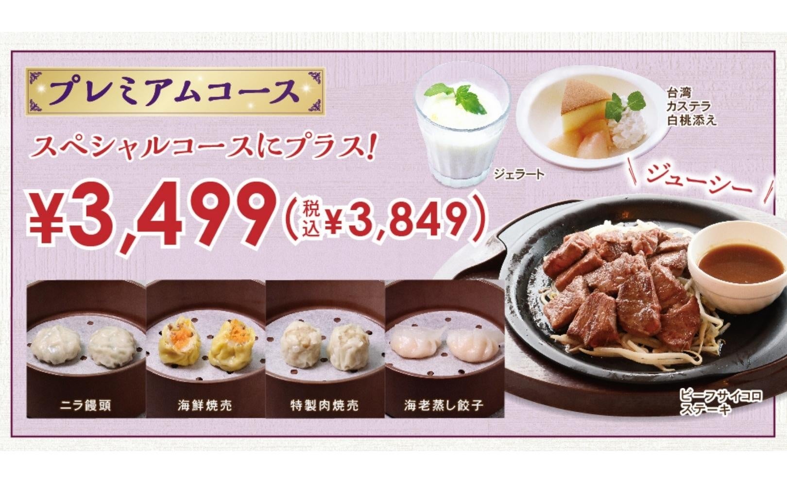 そして『プレミアムコース』では、スペシャルコースのラインナップに加え、プリプリ食感の海老がゴロっと入った『海老蒸し餃子』や、彩り鮮やかな『海鮮焼売』など、4種類の飲茶、そして、程よい食感と濃厚な味が特徴の肩ロースを使用した『サイコロステーキ』。更に!食後には、ふわっふわ食感の『台湾カステラ』などのデザートも食べ放題!