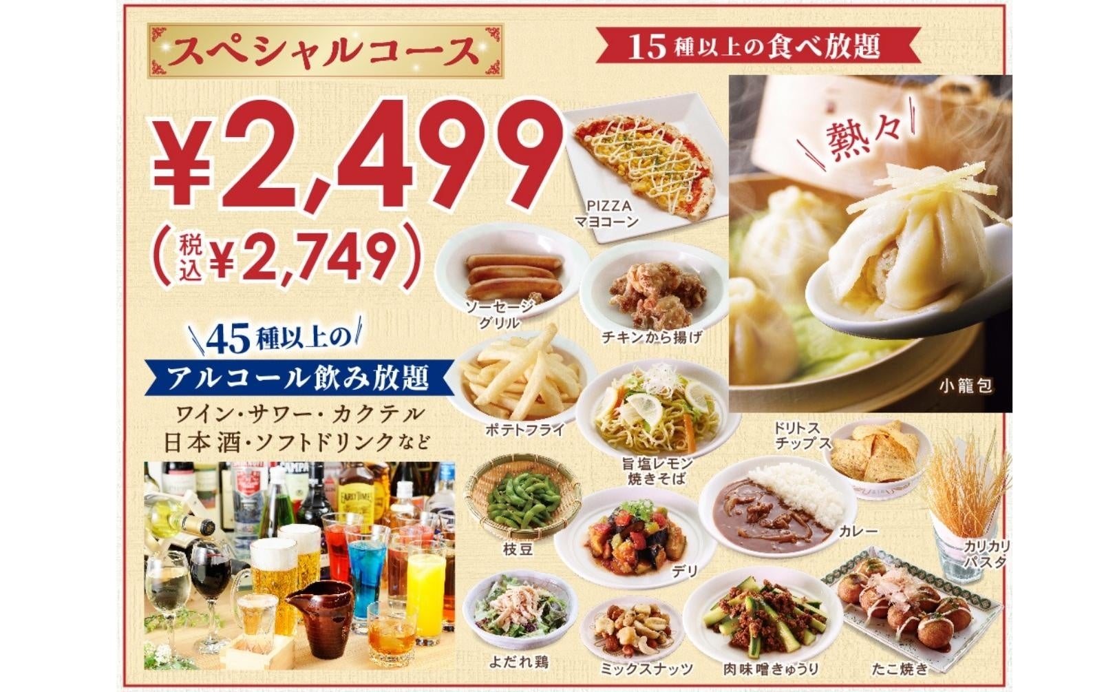 一番人気の『スペシャルコース』では、枝豆や、ソーセージグリル、旨塩レモン焼きそばなど、お酒との相性抜群な15種以上のお料理に加え、オーダーを受けてから蒸しあげて熱々の出来立てをご提供する肉汁溢れる『自家製小籠包』の食べ放題をご堪能いただけます。