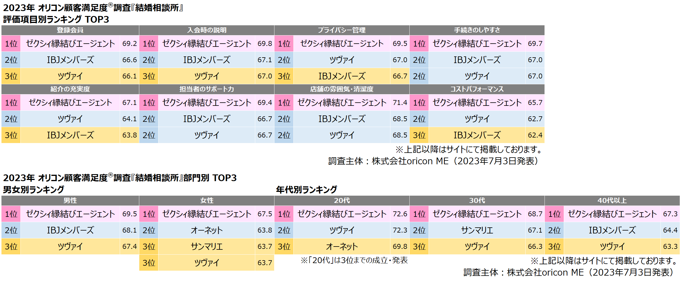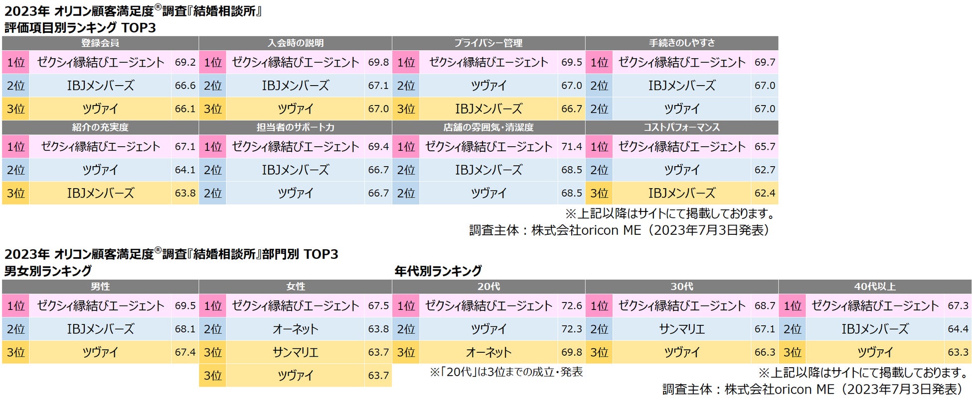総合2位には【IBJメンバーズ(株式会社IBJ 本社:東京都新宿区)】と【ツヴァイ(株式会社ZWEI 本社:東京都中央区)】が同点ランクイン。【IBJメンバーズ】は昨年総合3位から、【ツヴァイ】は総合4位からのランクアップとなりました。