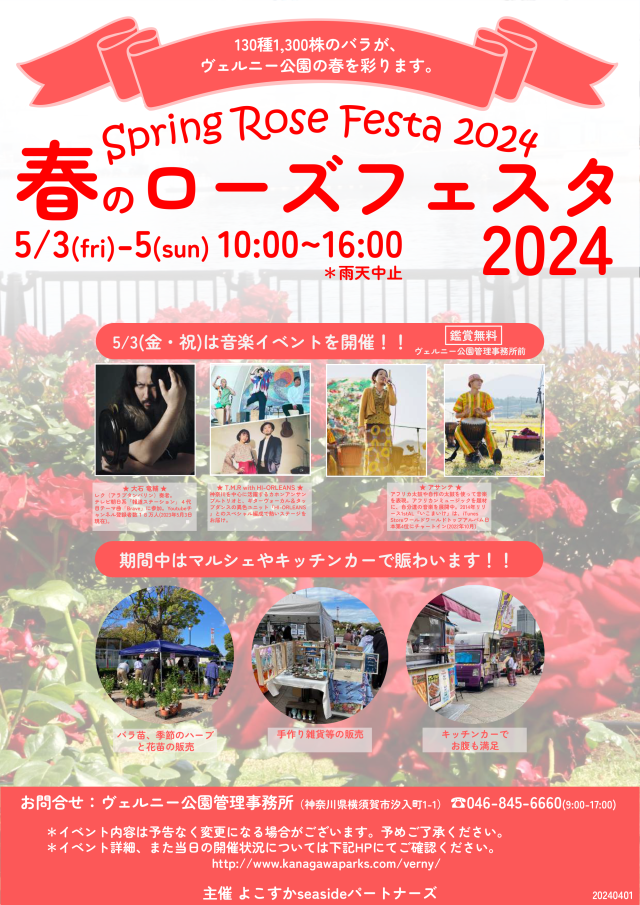さらに、バラの開花シーズンにあわせて、ゴールデンウィークにあたる2024年5月3日(金・祝)~5日(日)の3日間には公園内でマルシェを開催いたします。バラ苗やバラグッズの販売、キッチンカーを楽しむことができます。さらに5月3日(金・祝)には、無料の音楽ライブも。入園無料のフランス式花壇のバラ園で、横須賀港を臨み、華やかな花々が海風に揺れる様子をお楽しみください。