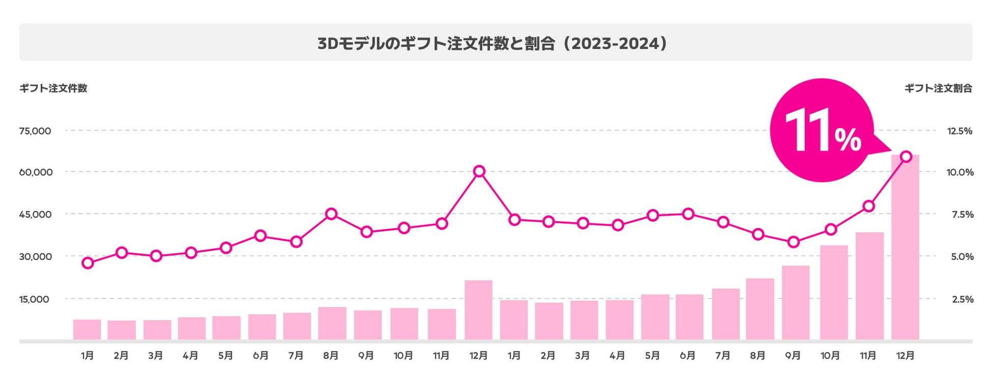 以下は2023年から2024年にかけての、3Dモデルカテゴリにおけるギフト機能を利用した注文件数とその割合を表したグラフです。