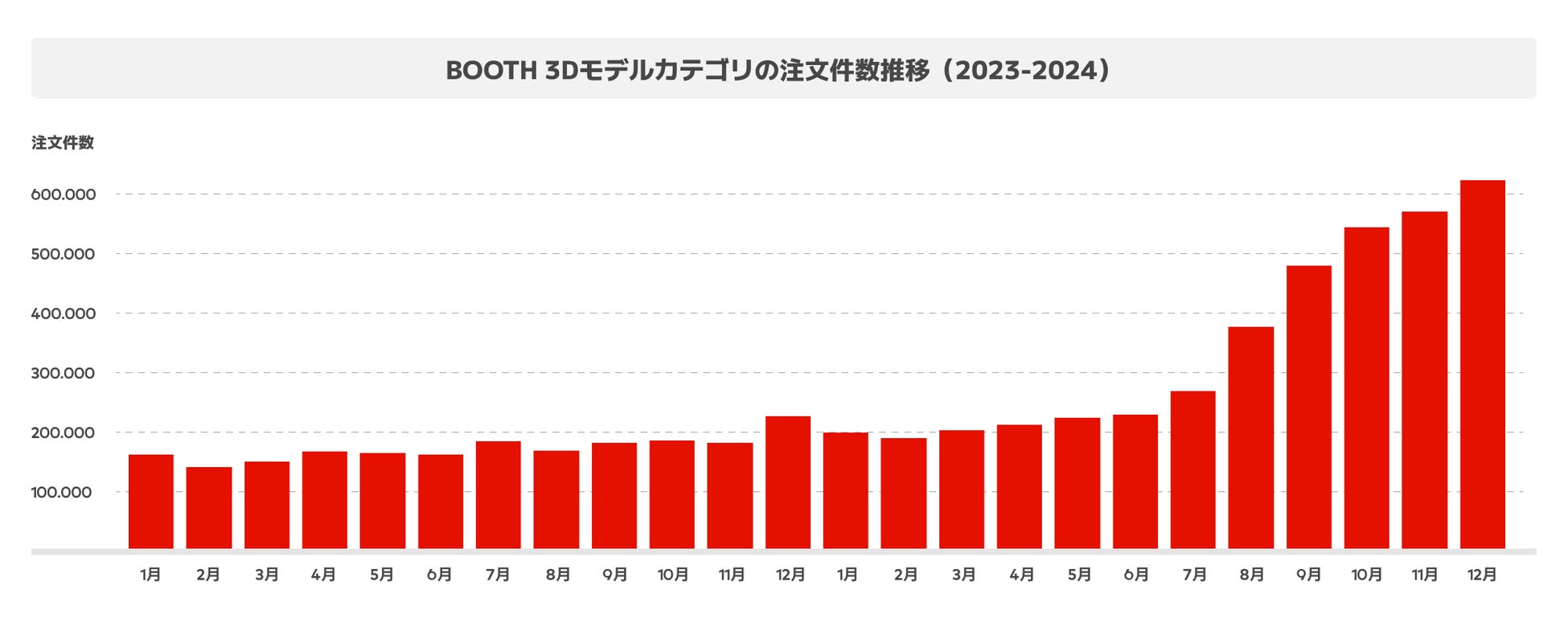 以下は、BOOTH 3Dモデルカテゴリにおける2023年から2024年の月ごとの注文件数を表したグラフです。注文件数が2024年夏以降に急激に伸びています。