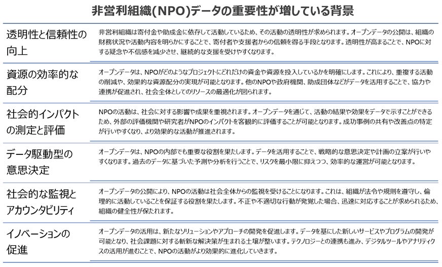 これらの要素が相まって、非営利組織分野におけるオープンデータの重要性はますます高まっています。データの透明性と活用が進むことで、NPOは社会に対してより大きなインパクトを与え、持続可能な発展を遂げることが期待されています。