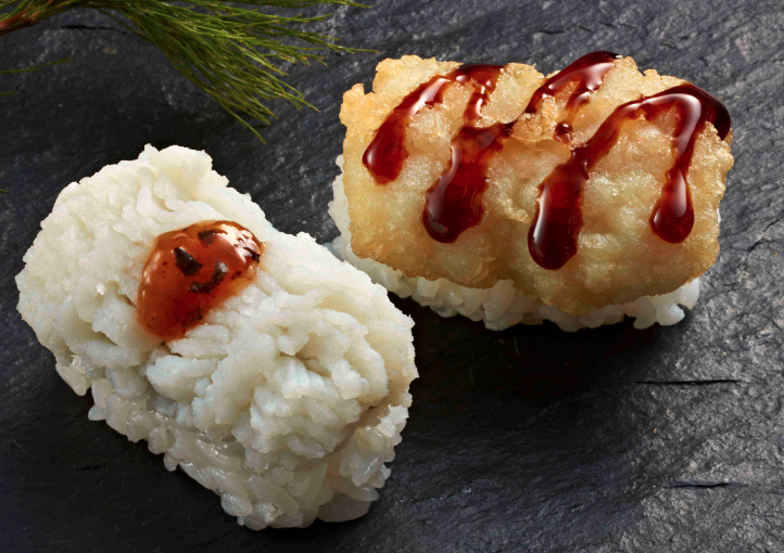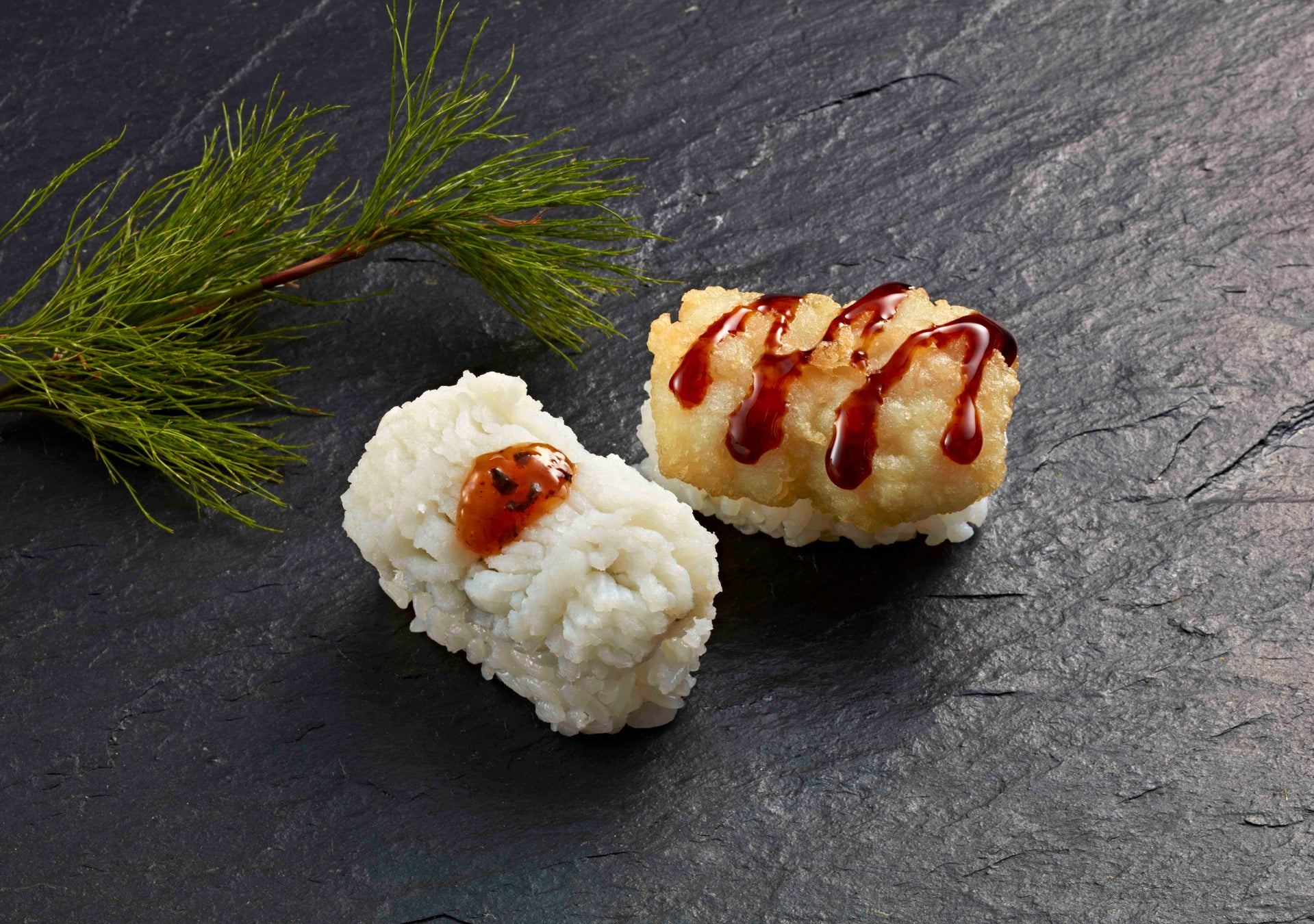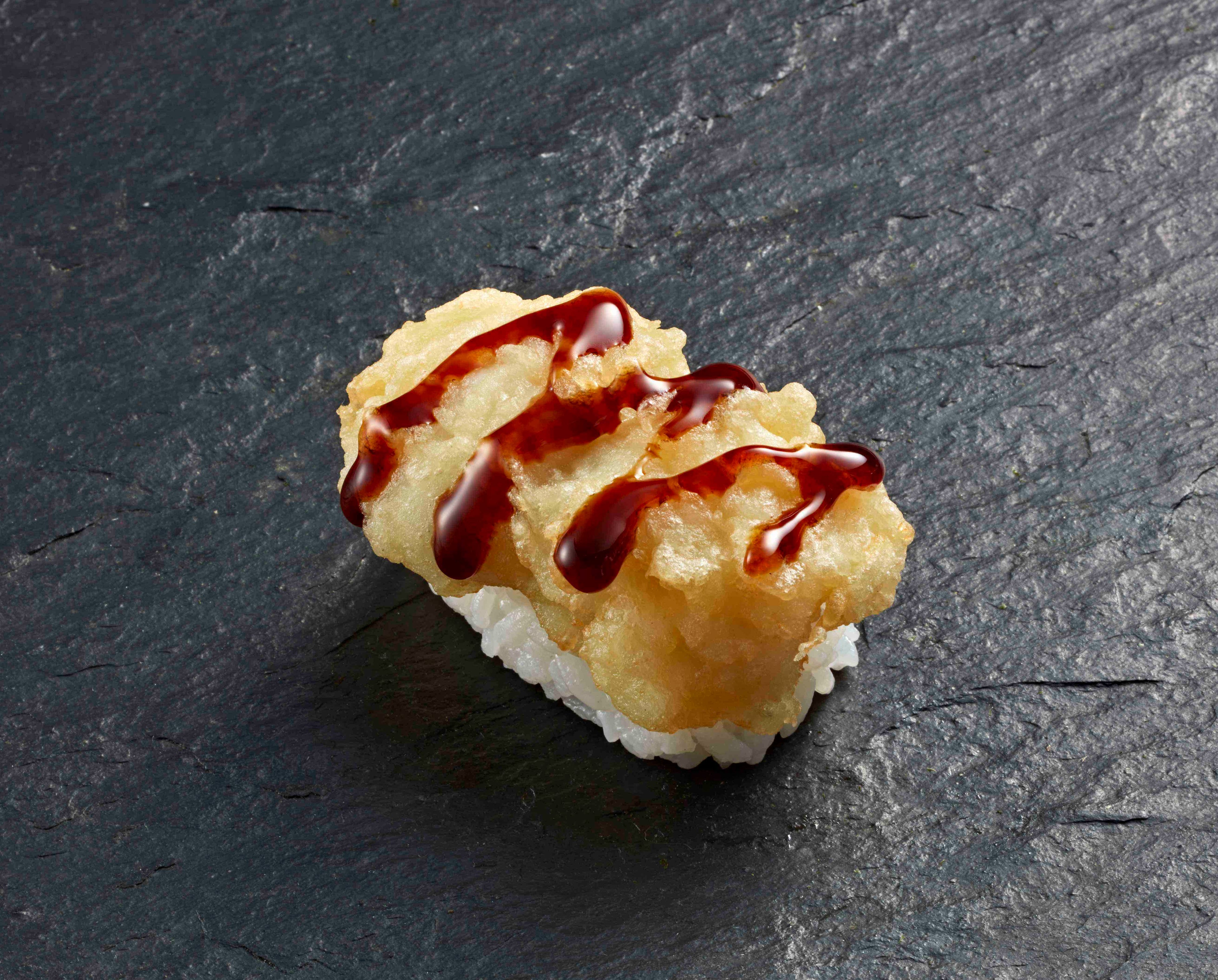 「国産 活き〆鱧天握り」ふっくらと湯引きした国産活き〆鱧を天ぷらにしました。揚げたての天ぷらに濃く深く甘辛い煮詰めを合わせた子供も大好きな一品です。