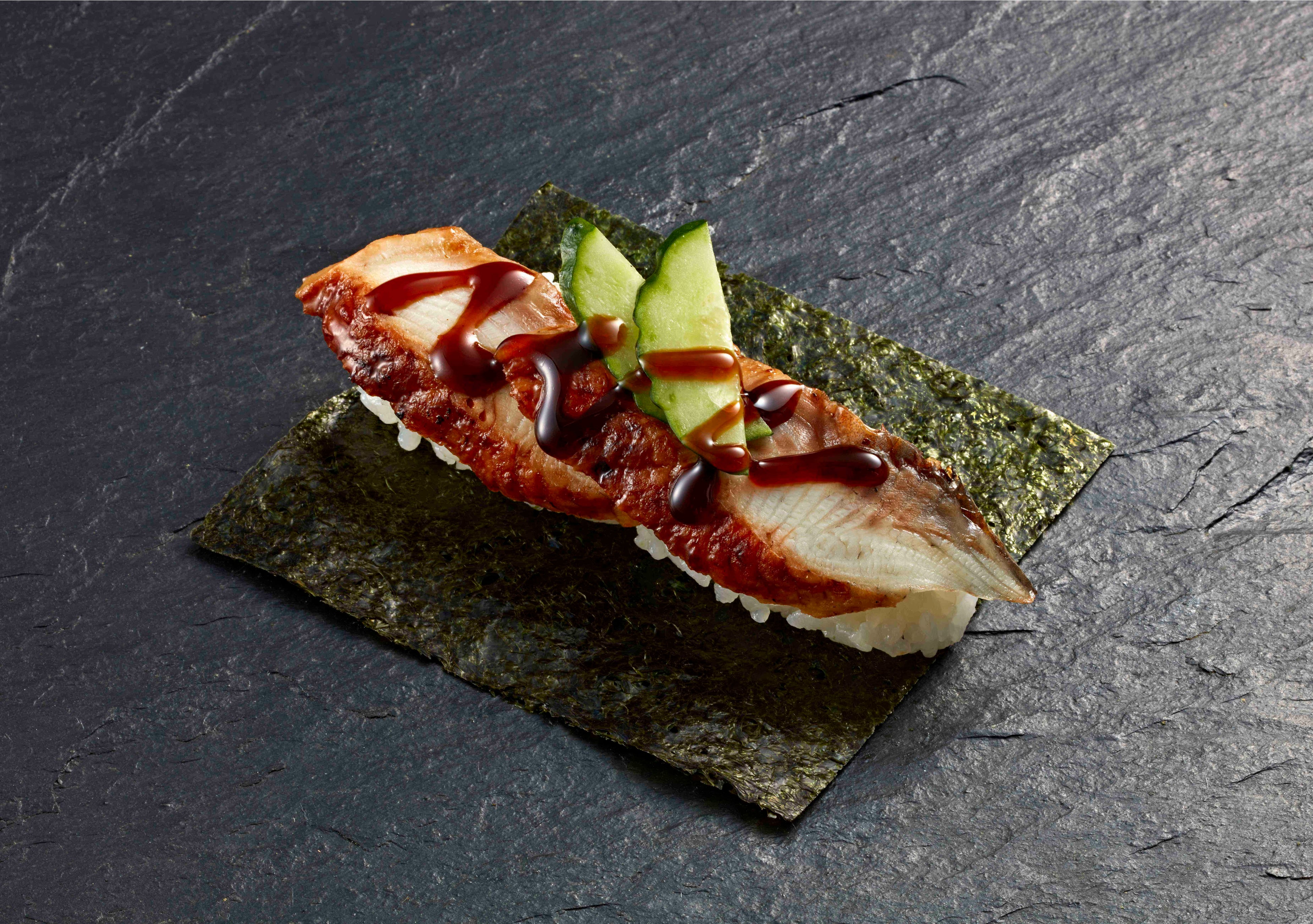 「炙り鰻握り」厳選したエサで丁寧に育てられた鰻を、こだわりのタレで三度にわたりじっくり香ばしく焼き上げ、握り寿司にしました。