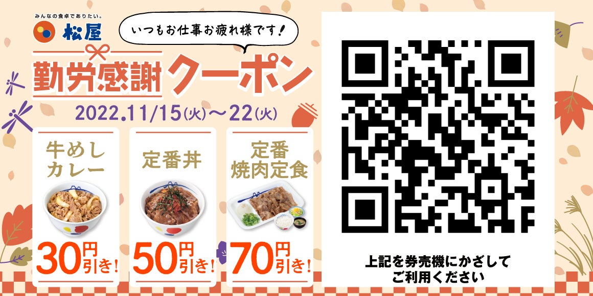 このたび松屋フーズ(本社:東京都武蔵野市、代表取締役社長:瓦葺一利)では、松屋デジタルジャック企画として、2022年11月15日(火)から11月22日(火)まで、牛めし・カレー・定食・その他丼の「松屋」にてご利用可能な「勤労感謝クーポン」を配布いたします