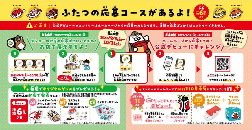 本キャンペーンは、小学6年生までを対象にWEB(ホームページ)や店頭の応募用紙にお客様の考えた“だっこずし”をかいて応募するだけでご参加いただけます。応募コース1つ目の「WEB(ホームページ)応募」では、応募いただいた作品の中からグランプリに輝いたキャラクターが、公式“だっこずし”キャラクターとしてデビューいたします。グランプリに輝いた方には、世界に1体だけの新キャラクターのぬいぐるみなどをプレゼントし、特別賞として50名の方にはオリジナルグッズをプレゼントいたします。