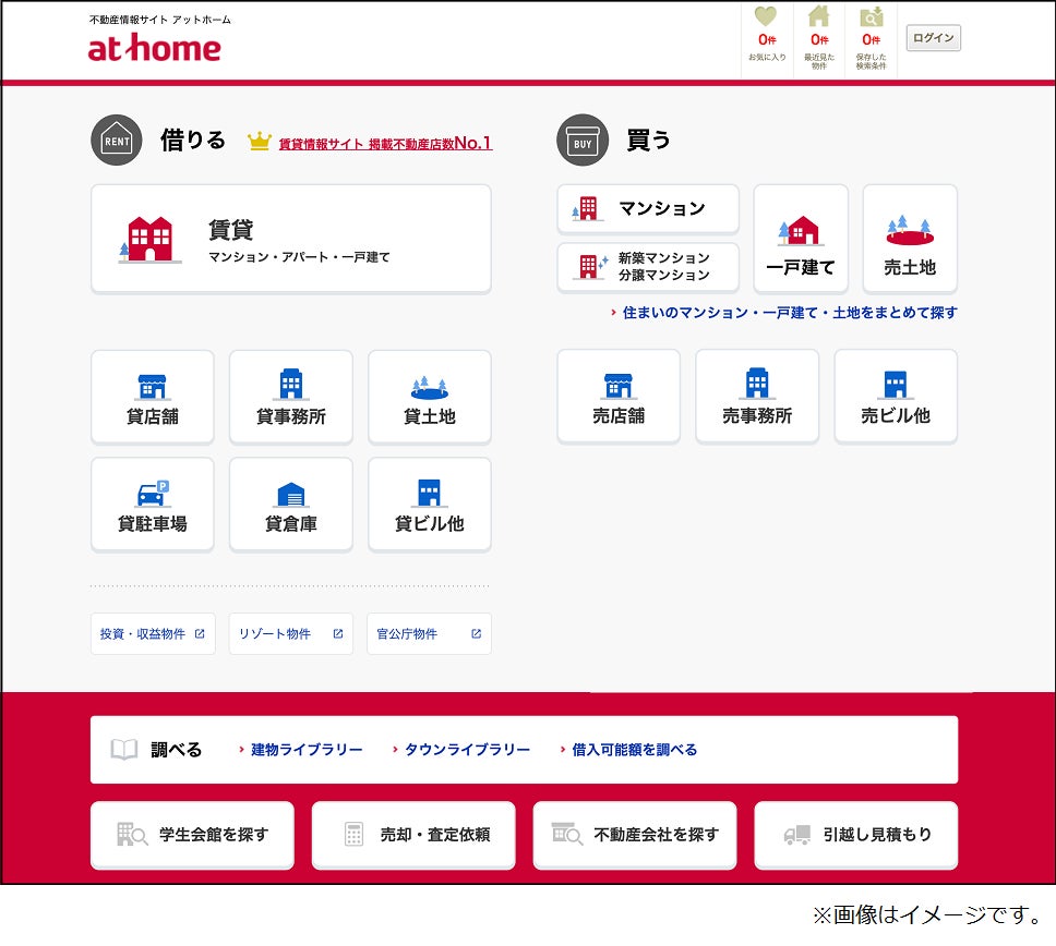 1996年よりアットホームが運営している、マンション・アパート・一戸建てや店舗・事務所など、全国の豊富な物件が探せる不動産情報サイトです。単身・カップル・ファミリー向けの賃貸・売買物件から店舗・オフィス向けの事業用物件まで幅広く物件情報を取りそろえています。