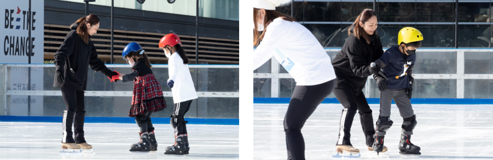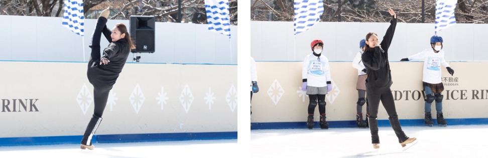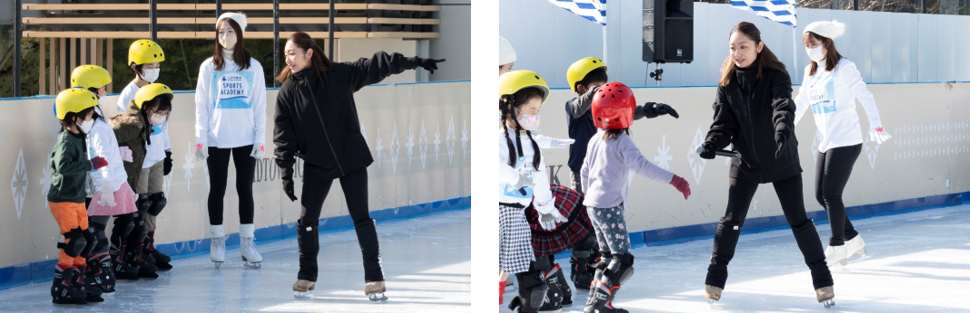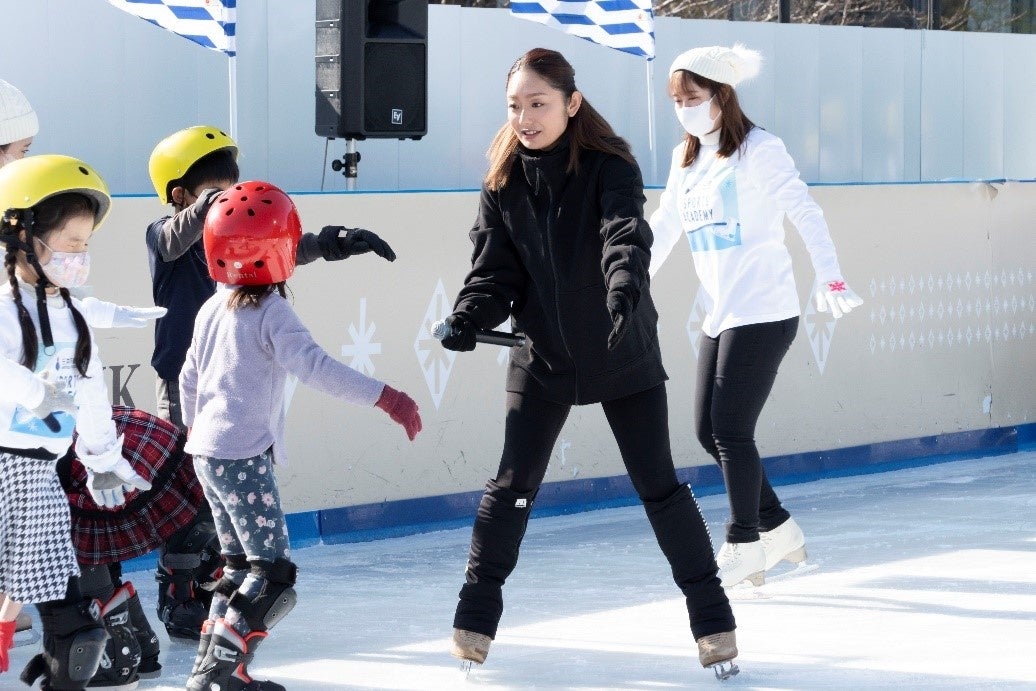 当日は2022年に続き特別講師としてプロフィギュアスケーターの安藤美姫さんをお迎えしました。昨年はオンライントークイベントとしての実施でしたが、本年はミッドタウンアイスリンクにて小学生を対象としたスケート教室を実施。イベントでは安藤さん自らが講師となり、参加者の力量に合わせてスケートの魅力を伝えるレッスンを行いました。