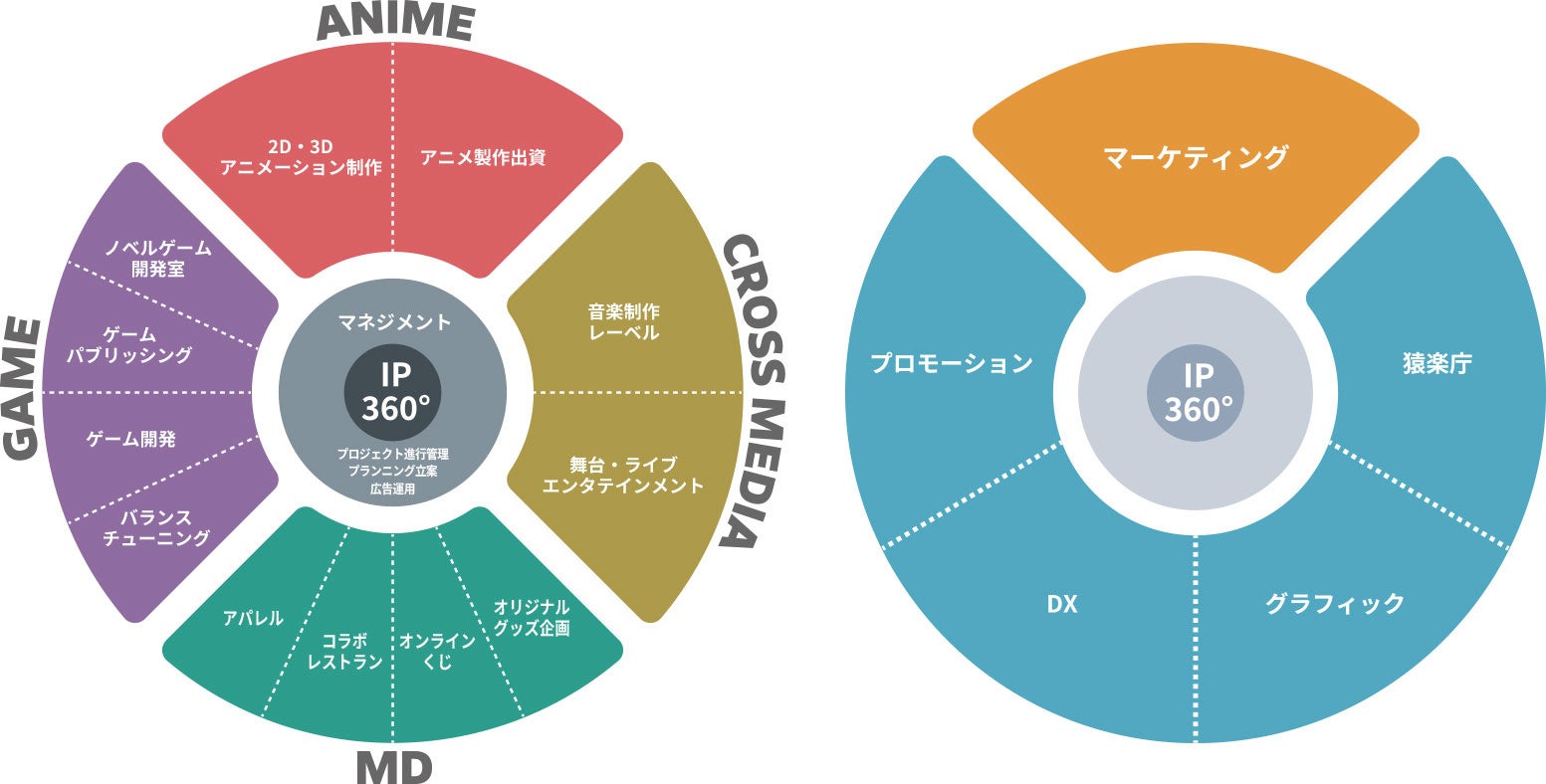 HIKEは、ポールトゥウィンホールディングスグループのメディア・コンテンツ業務を担う中核事業会社として、アニメーション、ゲーム、音楽、舞台、映画など、様々なコンテンツの企画・制作、商品化・販売までのトータルプロデュース事業を行っております。当社ではIPをアニメーション、ゲーム、音楽、舞台、映画などに展開し、その価値を最大化するIPの360°事業展開を進めております。