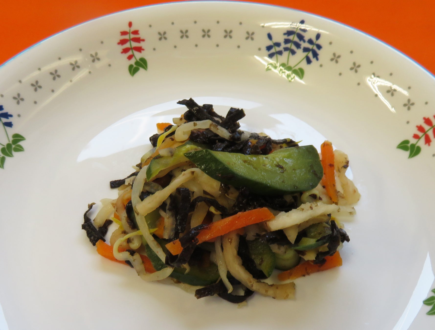 梅干しをドレッシングに使用したサラダです。鉄を摂るために、切り干し大根と海苔を使用します。 関根さんは、ご飯のお供に梅干しをよく食べていました。 |