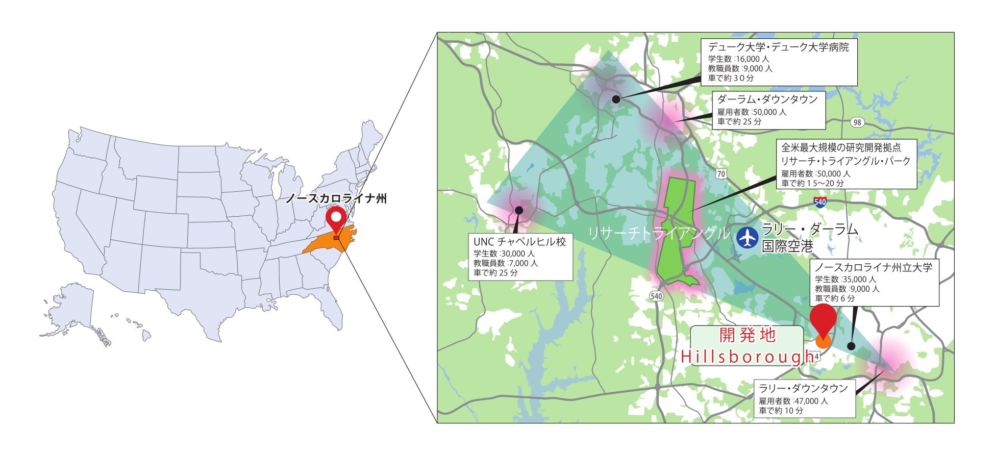 本物件はアメリカ東海岸の中心部に位置するノースカロライナ州の州都ラリー市に立地しています。ラリー市は首都ワシントンD.C.と南部の大都市アトランタを結ぶ州間高速道路(I-85)に近接しているため交通の利便性が高く、ノースカロライナ州立大学、デューク大学、ノースカロライナ大学チャペルヒル校を結ぶ教育と研究の一大拠点として知られる三角地帯「リサーチトライアングル」の中心に位置しています。また、300社以上の企業が集積するビジネス環境が形成されており、競争力のある人材を雇用可能な環境を背景に、安定した経済成長が期待できます。