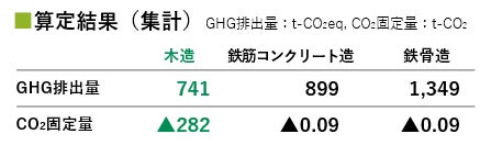 ※3. 林野庁調査をもとに住友林業の筑波研究所で試算(以下のグラフと表を参照)。林野庁「平成27年度 木材利用推進・省エネ省CO2実証業務 報告書」の資材数量をもとに3階建て事務所(1,500㎡)の躯体、外部、内部(設備除く)を対象として、新築時から解体時までのライフサイクル全体を対象として算定。