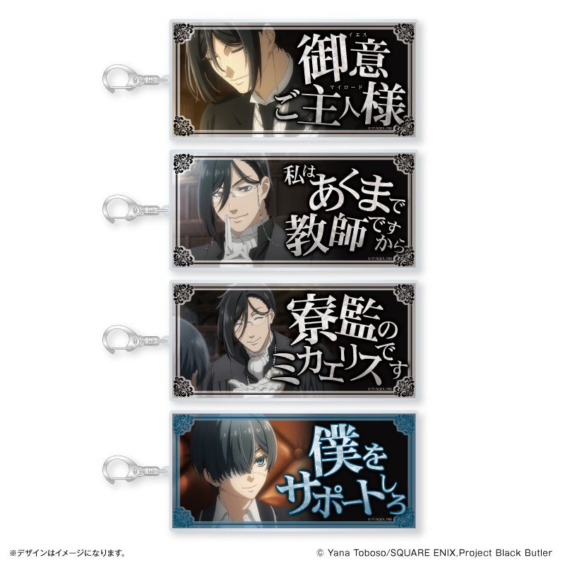アニメ『黒執事 -寄宿学校編-』より、セバスチャンとシエルのセリフが大きく描かれた特大セリフキーホルダー等のオリジナルグッズ全4アイテム(合計28種)が登場!