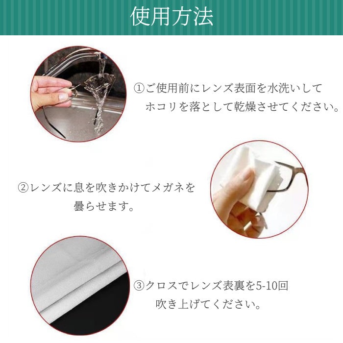 1. メガネを傷つけないため、使用前にレンズ表面を水洗いし、