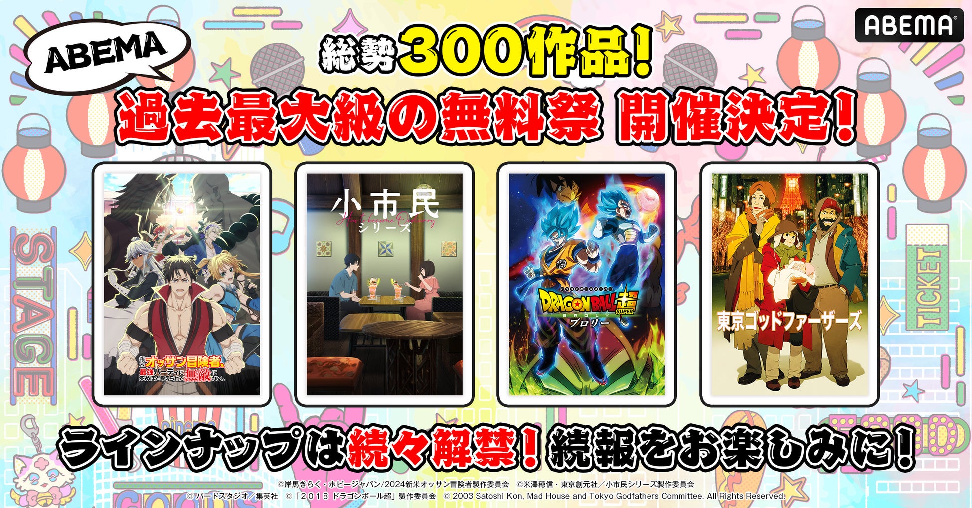 このたび、「ABEMA」内に設置される“ABEMAエリア”にて、アニメ300作品の無料一挙放送および、期間限定の無料配信が決定いたしました。『小市民シリーズ』『新米オッサン冒険者、最強パーティに死ぬほど鍛えられて無敵になる。』『モブから始まる探索英雄譚』などの「ABEMAアニメ祭」参加作品をはじめ、「劇場版ドラゴンボール」シリーズ全21作品、『妄想代理人』、『東京ゴッドファーザーズ』など、視聴者からのリクエストを元に決定した人気アニメ作品の数々を、9月14日(土)から23日(月・祝)までの「ABEMAアニメ祭」開催期間中、続々と無料一挙放送・無料配信いたします。なお、放送日時などの詳細は順次発表予定です。続報にご期待ください。