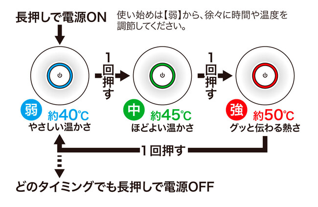 本体の電源を長押ししてONにし、弱(約40℃)・中(約45℃)・強(約50℃)からお好みのモードを選びます。