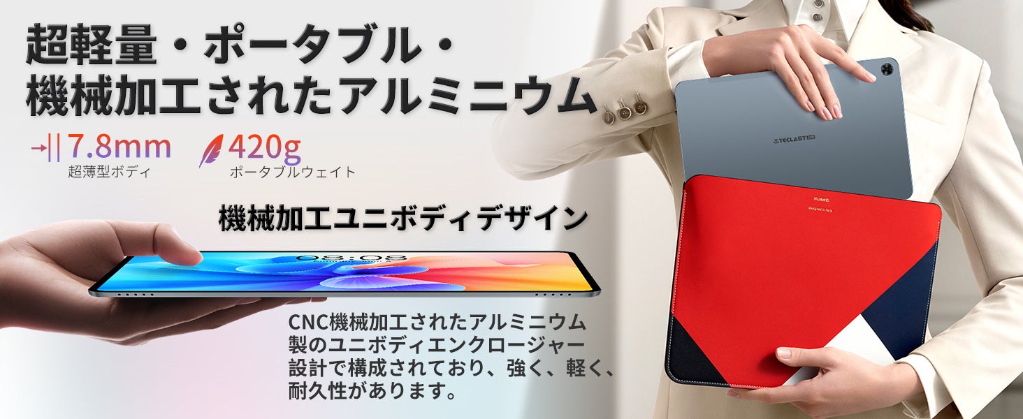 CNC機械加工されたアルミニウム製のユニボディエンクロージャー設計で構成されており、強く、軽く、耐久性があります。10.4インチ2kベゼルレスディスプレイを使用して、映画館のような魔法を提供可能です。BOEとTDDIテクノロジーが利用されたディスプレイは、タッチセンサーをLCDの既存の構造に統合し、タッチ応答性を向上させます。また、T-Color 2.0カラー最適化アルゴリズムにより、より鮮やかでリアルな色が表示されます。