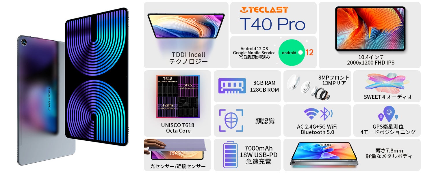 Teclast T40Proは、UNISOC Tiger T616プロセッサを利用するために、2.0GHzの周波数と12nm低消費電力を備え、2つのArm Cortex-A75ハイパワーコアと6つのCortex-A55インテリジェントAIコアを搭載しています。 発熱を抑えながら優れた性能を維持できます。距離センサー、光センサーなどを搭載します。明るさ自動調整できます。ケースを利用すると、自動ロック/ロック解除も簡単に実現できます。