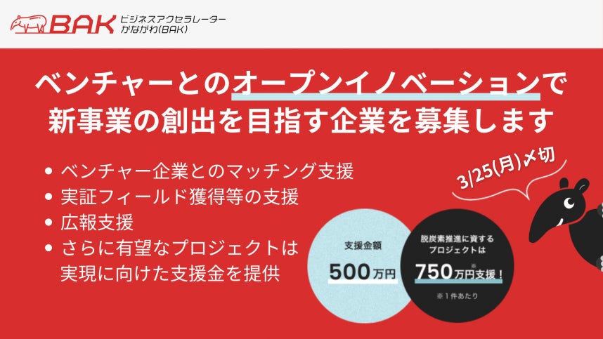 県内に拠点を持つ大企業等と質の高いベンチャー企業による連携プロジェクトを創出するとともに、オープンイノベーションに向けたコミュニティ形成を目的として、大企業・ベンチャー企業・研究機関・支援機関等が参画する協議会「ビジネスアクセラレーターかながわ(BAK)」を運営する取組。県内で、積極的にオープンイノベーションに取り組むことを希望する企業を随時募集中。