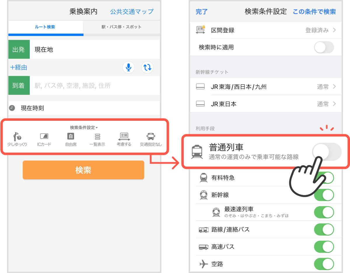電車を使わずにバスだけで移動したい時に「検索条件設定」内の利用手段の項目にある「普通列車」をオフにすることで、普通列車に乗らずバスのみで移動できるルート検索が可能になります(※3)。