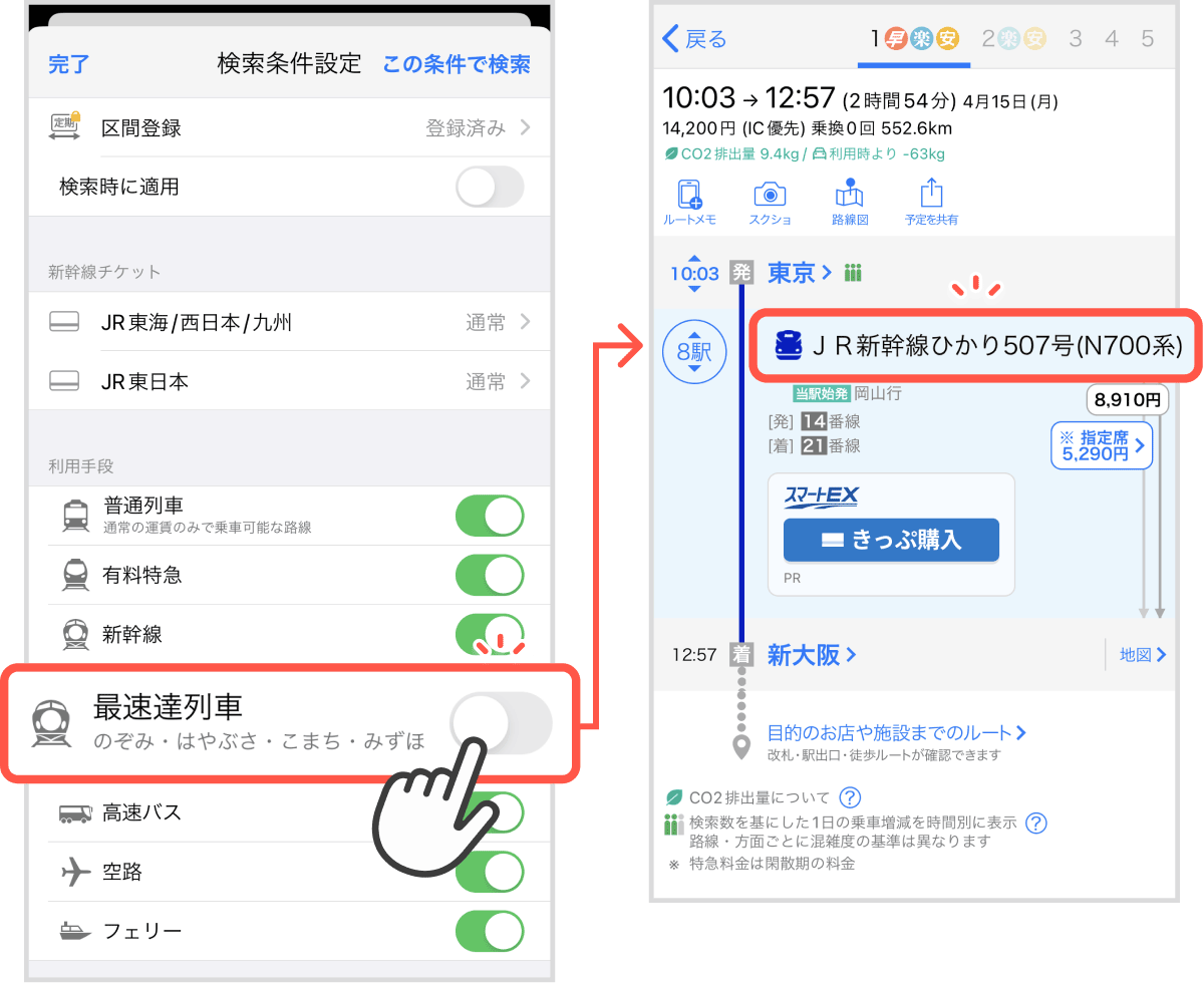 「検索条件設定」内の利用手段の項目にある「最速達列車」(※4)をオフにすることで、「のぞみ」「はやぶさ」「こまち」「みずほ」を利用しないルート検索ができます(※5)。「こだま・ひかり検索」は、東海道新幹線に限らず、東北新幹線や九州新幹線などでも同様の検索が可能です。そのため、安価なルートを探したい時や、様々な駅に停車しながら新幹線での移動をゆっくりと楽しみたい時に便利な機能です。
