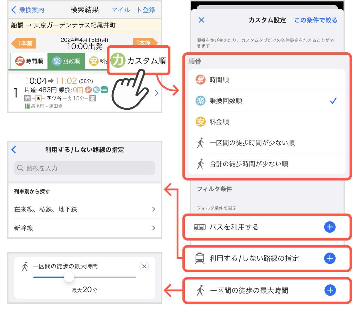 検索結果画面の上部に「早(時間順)」「楽(乗換回数順)」「安(料金順)」に加え、「カスタム順」が追加されます。「カスタム順」をタップすると、自分に合った条件を細かく選べる「カスタム設定」が可能です。