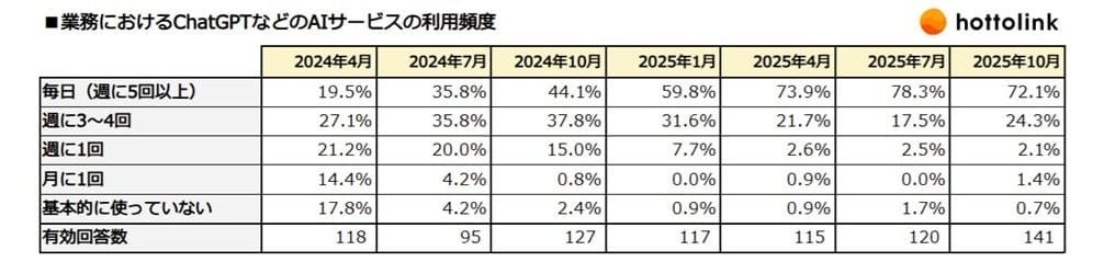SNSマーケティング支援サービスを提供する株式会社ホットリンク(本社:東京都千代田区、証券コード:3680、代表取締役グループCEO:檜野安弘、以下ホットリンク)は、生成AIツールの活用状況に関する社内定点調査(2025年10月度)を実施しました。
