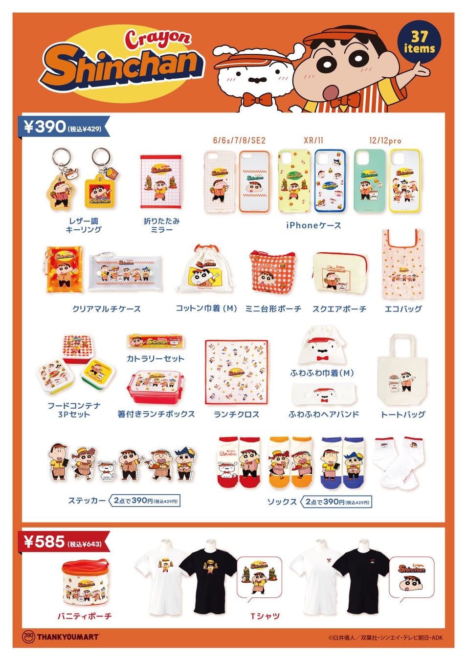 サンキューマートと『クレヨンしんちゃん』のコラボは今回が第5回目となり、これまでにも「韓国ファッション」「パジャマシリーズ」といったサンキューマートでしか手に入らないオリジナルデザインのアイテムを展開してきました。毎回新作を発表するとたくさんの反響をいただく『クレヨンしんちゃん』コラボの新作全37アイテムを、6月中旬より入荷順次販売開始します。