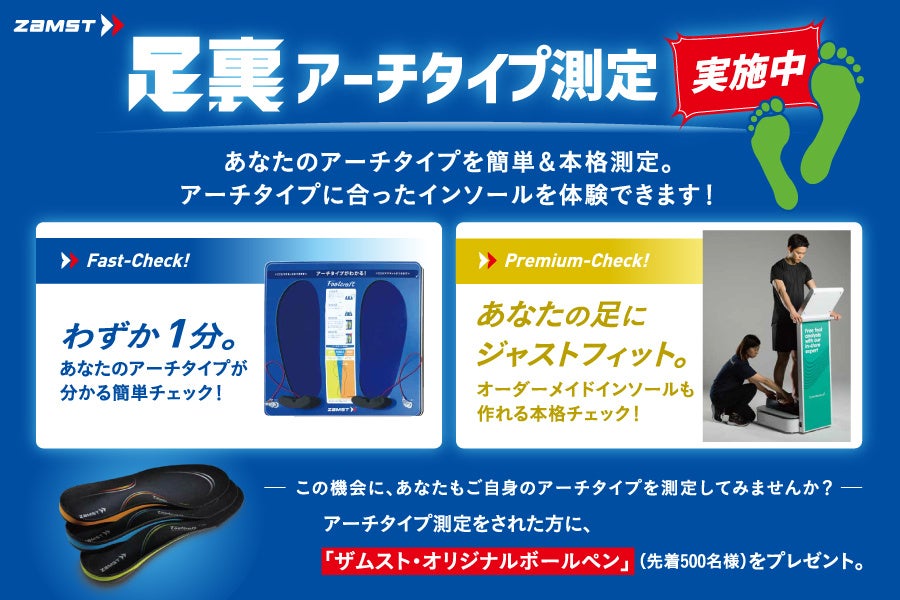 なお、上記2種類のアーチタイプ測定をしていただいた方、先着500名様に、ザムストオリジナルボールペンをプレゼントいたします。