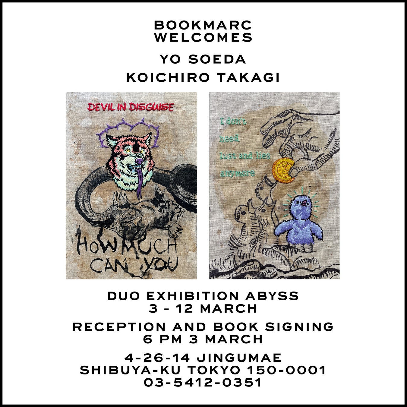 ニューヨーク発ファッションブランド「マーク ジェイコブス」が手掛けるブックストア「BOOKMARC(ブックマーク)」にて、添田陽氏と高木耕一郎氏による二人展『Abyss』を開催します。OAC, breakfast, STRUGGLE FOR PRIDEなどのハードコアパンクバンドのドラマーとして知られる添田氏とハードコアパンクを愛する高木氏の不定期な二人展は実に5年振り。モノクロのインクやチャコールで描く躍動的で混沌とした添田のグルームな作品と、カラフルな動物達が生きる高木の鮮やかで不思議な刺繍作品とのコントラストをお楽しみください。二人で共同制作された作品も多数展示されます。本展にあわせてそれぞれの図録も発売。初日3/3(金)18時からレセプションとサイン会も開催します。皆様のご来店をお待ちしております。