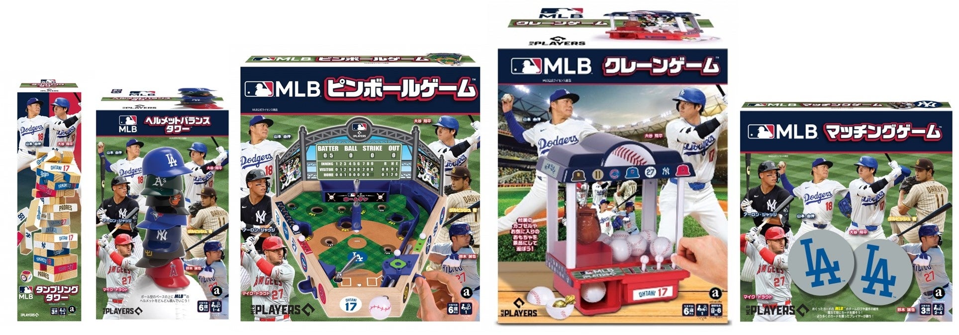 このたび展開するMLBおよび MLB Players, Inc.,公式ライセンス商品は、2024年9月より販売を開始している、野球場をかたどった「MLBピンボールゲーム」、グローブ型のクレーンと野球ボール型のカプセルで遊ぶ「MLBクレーンゲーム」、選手やチームロゴがデザインされたカードを揃える「MLBマッチングゲーム」の3商品と、2024年10月以降発売予定のブロックにチームロゴがデザインされた「MLBタンブリングタワー」(10月中旬発売予定)、チームロゴが描かれたミニヘルメットを積んでいくバランスゲーム「MLBヘルメットバランスタワー」(11月下旬発売予定)の計5商品です。日本でも人気のMLBをモチーフとしており、おもちゃ本体およびパッケージには、各チームのロゴに加え、MLBで活躍する大谷翔平選手やアーロン・ジャッジ選手、ダルビッシュ有選手、鈴木誠也選手、山本由伸選手、マイク・トラウト選手がデザインされています。ゲームとして遊ぶのはもちろん、MLBグッズのコレクションとして、子どもからキダルト(子どもの心を持った大人たち)までお楽しみいただける商品です。