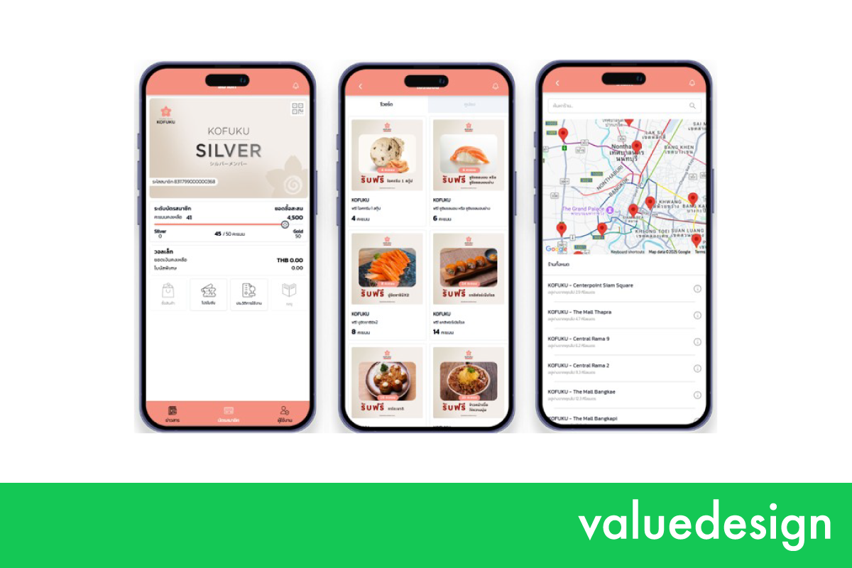 バリューデザインが今回サービスを提供した「KOFUKU」は、現在タイに13店舗を構える和食レストランです。「幸福」をブランドコンセプトに、厳選された食材を使い、心の込もった丁寧な日本料理を提供しています。2025年7月からリピーター促進を目的にモバイルCRMサービスを導入されました。メンバーズカードは、100バーツのお支払いごとに1ポイントを付与。貯まったポイント数に応じて会員ランクがアップします。