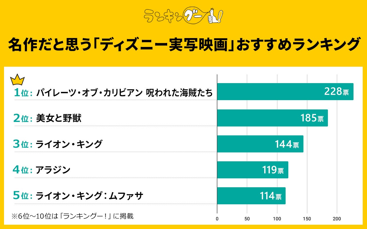 ディズニー新作実写映画『白雪姫』が2025年3月20日に公開。これを受けて、ランキングー!ではランキングを調査。10~40代の男女(性別回答しないを含む)2,685名に「名作だと思うディズニー実写映画は?」というアンケートを行い、TOP10を決定しました。ここではTOP5をご紹介します。