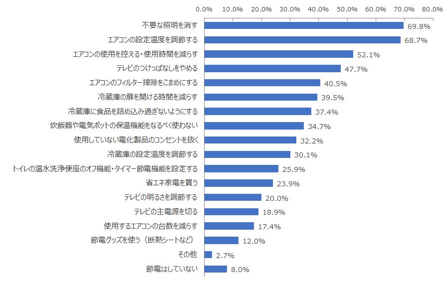 昨今の電力ひっ迫の恐れや電気料金の値上がりする中、電力各社では契約者に節電を促進する取り組みが進んでいます。そこで、現在取り組んでいる節電の内容について調査したところ、最も高いのは「不要な照明を消す」(69.8%)となりました。次いで「エアコンの設定温度を調節する」(68.7%)、「エアコンの使用を控える・使用時間を減らす」(52.1%)が続きました。一方で、「節電グッズを使う(断熱シートなど)」(12.0%)や「使用するエアコンの台数を減らす」(17.4%)、「テレビの主電源を切る」(17.4%)といった節電の実施率は低い結果となりました。