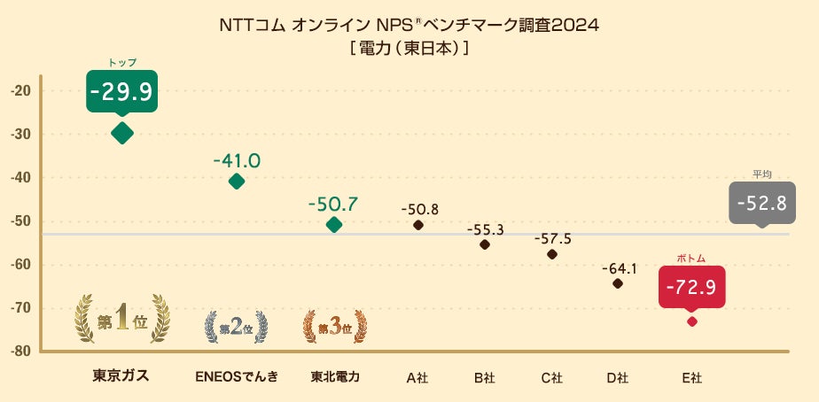 東日本部門における電力会社8社のうち、NPSのトップは東京ガス(-29.9ポイント)、2位はENEOSでんき(-41.0ポイント)、3位は東北電力(-50.7ポイント)となりました。8社のNPS平均は-52.8ポイント、またトップ企業とボトム企業との差は43.0ポイントとなりました。