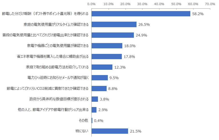 また、どのような仕組みがあったら節電に取り組みたくなるかを調査したところ、最も割合が高いのは「節電した分だけ報酬(ギフト券やポイント還元等)を得られる」(58.2%)となりました。次いで「家庭の電気使用量がリアルタイムで確認できる」(26.5%)、「普段の電気使用量と比べてどれだけ節電出来たか確認できる」(24.9%)が続きました。ロイヤルティ構成要素の「契約者の節電を促進する取り組み」はロイヤルティに与える影響度が高いことからも、節電チャレンジ・節電プログラムをはじめとする契約者が節電に取り組みたくなる仕組みを作ることの重要性が示唆されました。