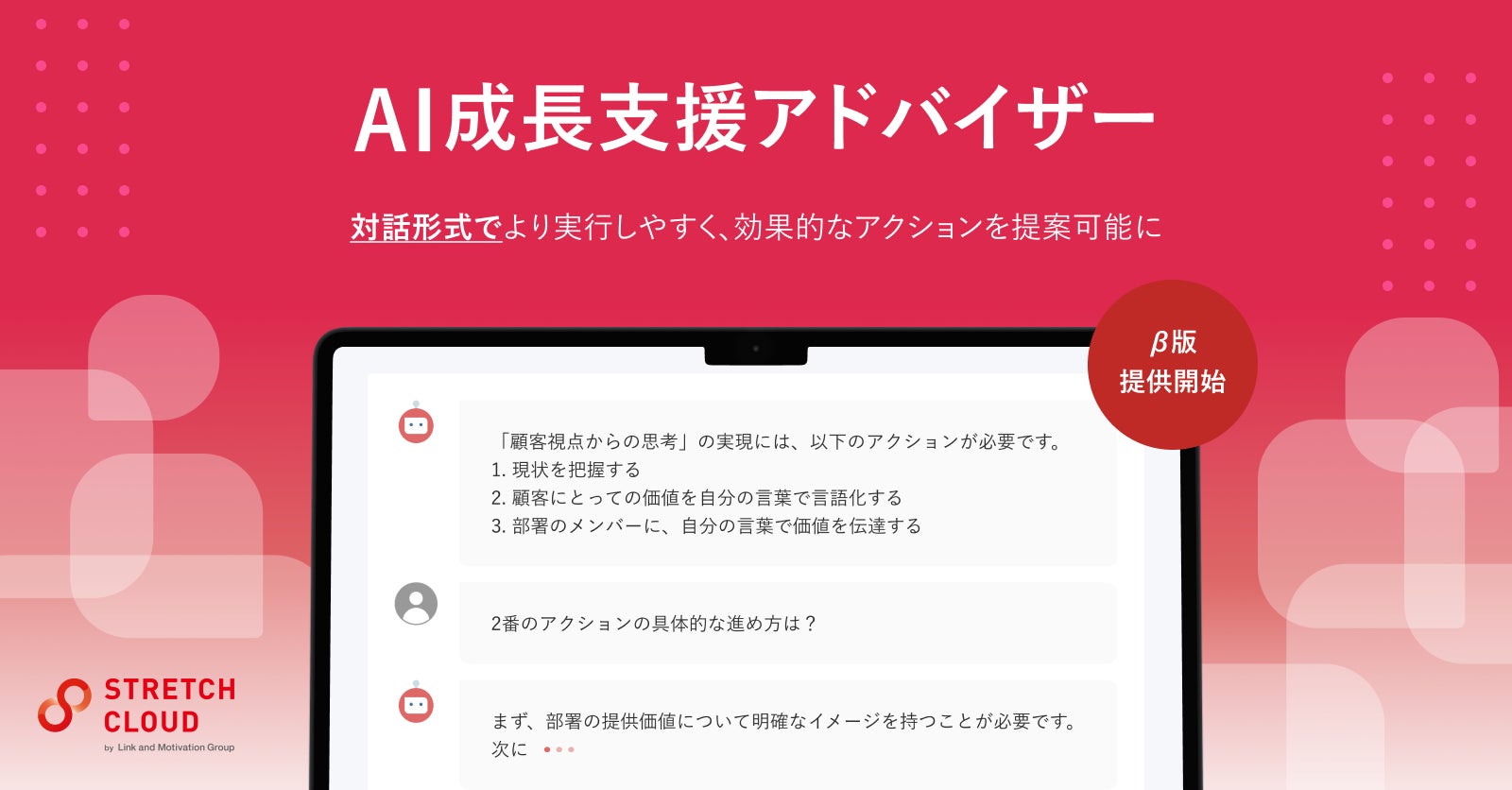 株式会社リンクアンドモチベーション(本社:東京都中央区、代表:小笹芳央、証券コード:2170、以下当社)は、最新チャットAIを活用した、個人成長支援機能「AI成長支援アドバイザー(β)」をリリースしたことを、下記の通りお知らせいたします。