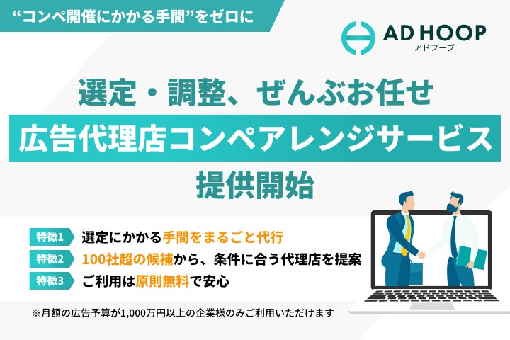 アドフープ、「広告代理店コンペアレンジサービス」を正式提供開始~ 原則無料でフルサポート。候補代理店の選定から交渉まで、コンペ開催の負担を軽減 ~