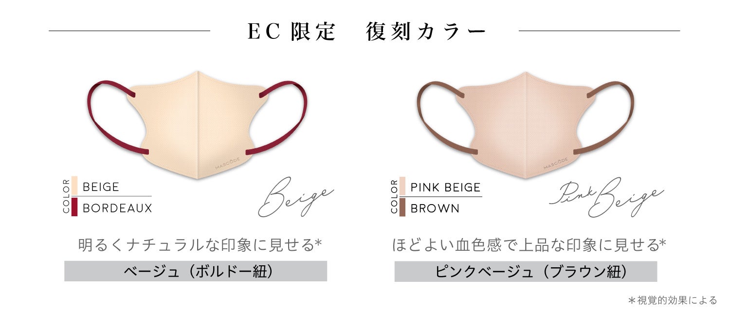 株式会社サン・スマイル(本社:東京都港区/代表取締役社長:田中徳也)はファッション性と機能性を両立させたマスクブランド『MASCODE(マスコード)』の3Dシリーズ内で人気の2カラーを4月21日よりサン・スマイル公式サイト(https://sunsmarche.jp/)限定で復刻発売します。今回復刻する2カラーはお客様アンケートで人気となった2色となります。