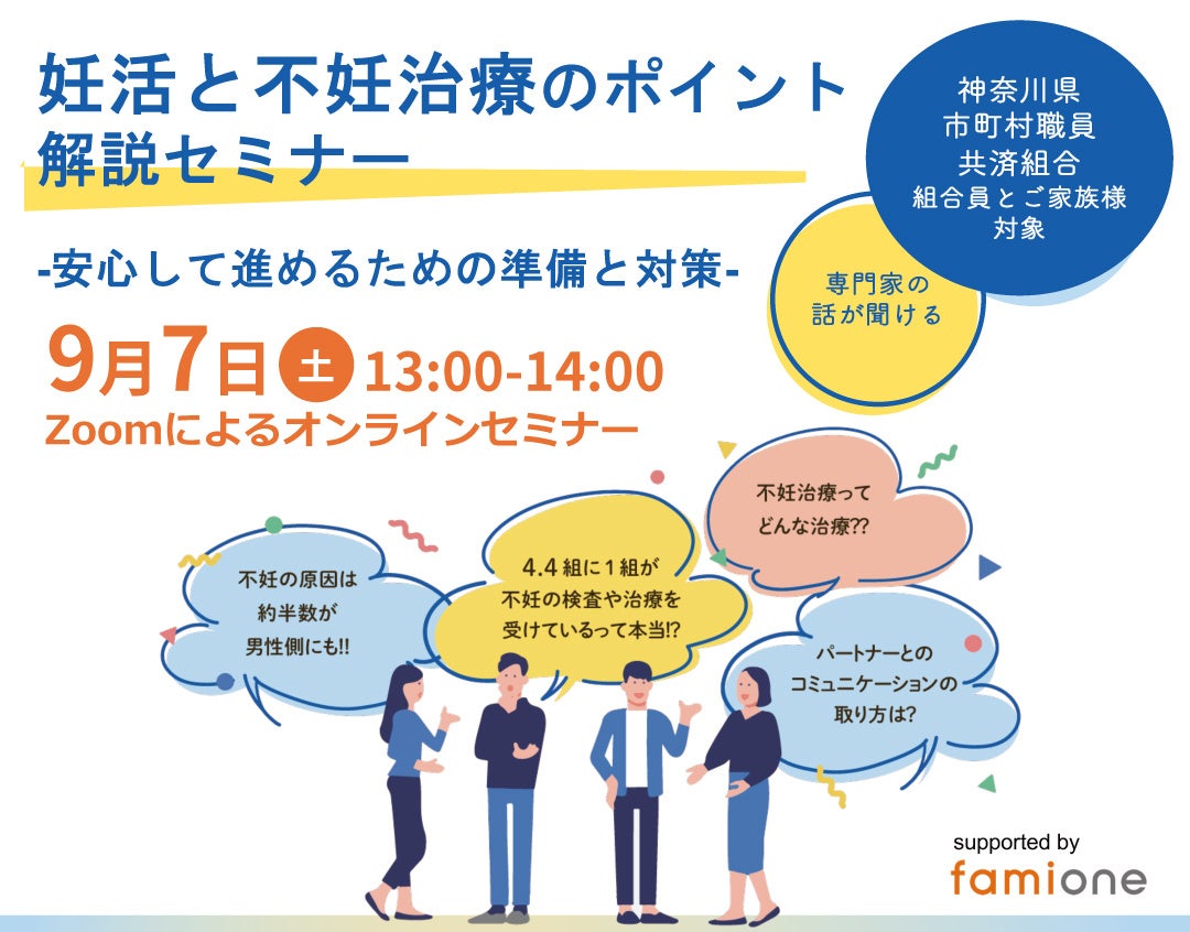 今回の神奈川県市町村職員共済組合の組合員とその家族に向けたセミナーでは株式会社ファミワンの不妊症看護認定看護師や臨床心理士が登壇し、妊活や不妊治療を考える際に知っておきたい男女のカラダの仕組みや妊活・不妊治療に関する知識、パートナーとのコミュニケーションの取り方を学べる機会となります。
