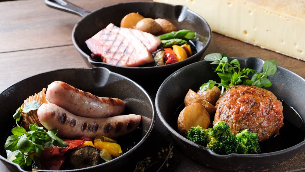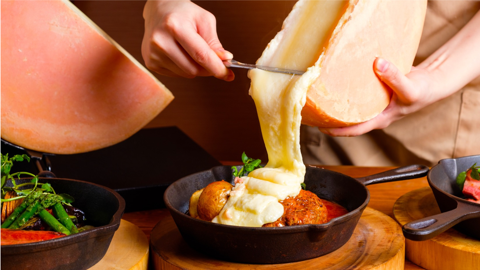 大人気のラクレットチーズは、厳選しこだわり抜いたフランス直輸入のラクレットレクリュを使用。ナッツのような香ばしさと、大迫力の滝のように流れる滑らかさが特徴で、日本人好みの味わいのチーズです。お客様の目の前で、3種類のグリルの上にダイナミックに流しかける人気商品となっております。