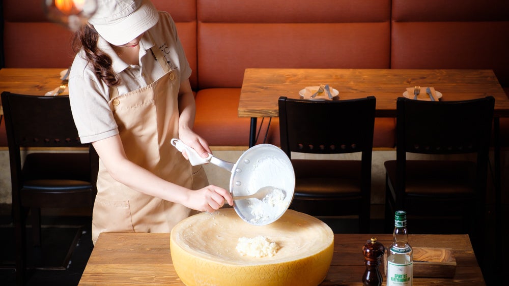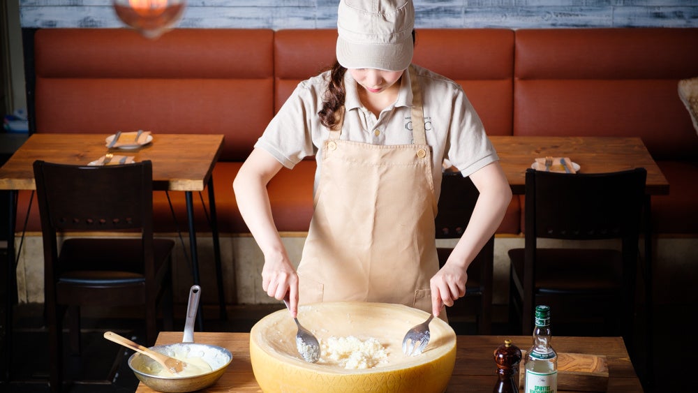 20kgのハードチーズ・グラナパダーノチーズをダイナミックに削りながら作るチーズリゾットや、まるでメロンのような見た目のミモレットチーズを丸ごとくり抜いて作ったボウルで仕上げる、チーズの香り豊かな「特製のカルボナーラ」など、チーズ専門店ならではの味をご用意しております。お客様の目の前で仕上げることにより、出来たての美味しさを五感で楽しんでいただける商品になっております。