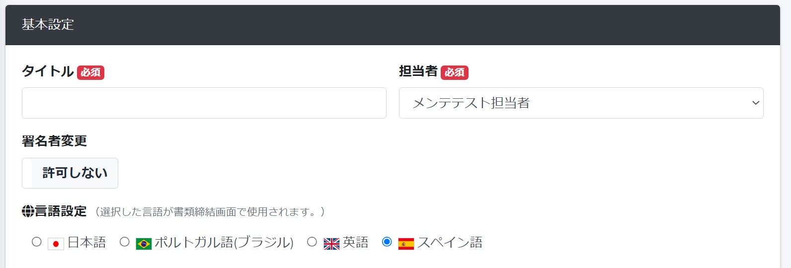 ※書類作成時の言語設定選択部分 テンプレート作成画面にも同様の箇所があります。