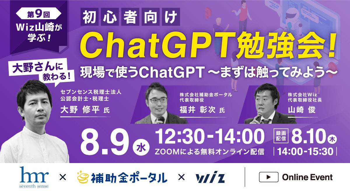 8月9日(水)、8月10日(木)※、株式会社Wiz(本社:東京都豊島区、代表取締役社長:山崎 俊)は、セブンセンス税理士法人 公認会計士・税理士の大野氏、株式会社補助金ポータル代表取締役の福井氏をゲストに迎え、ChatGPTをビジネスに活用する方法を学ぶ、「初心者向けChatGPT勉強会」を開催いたします。