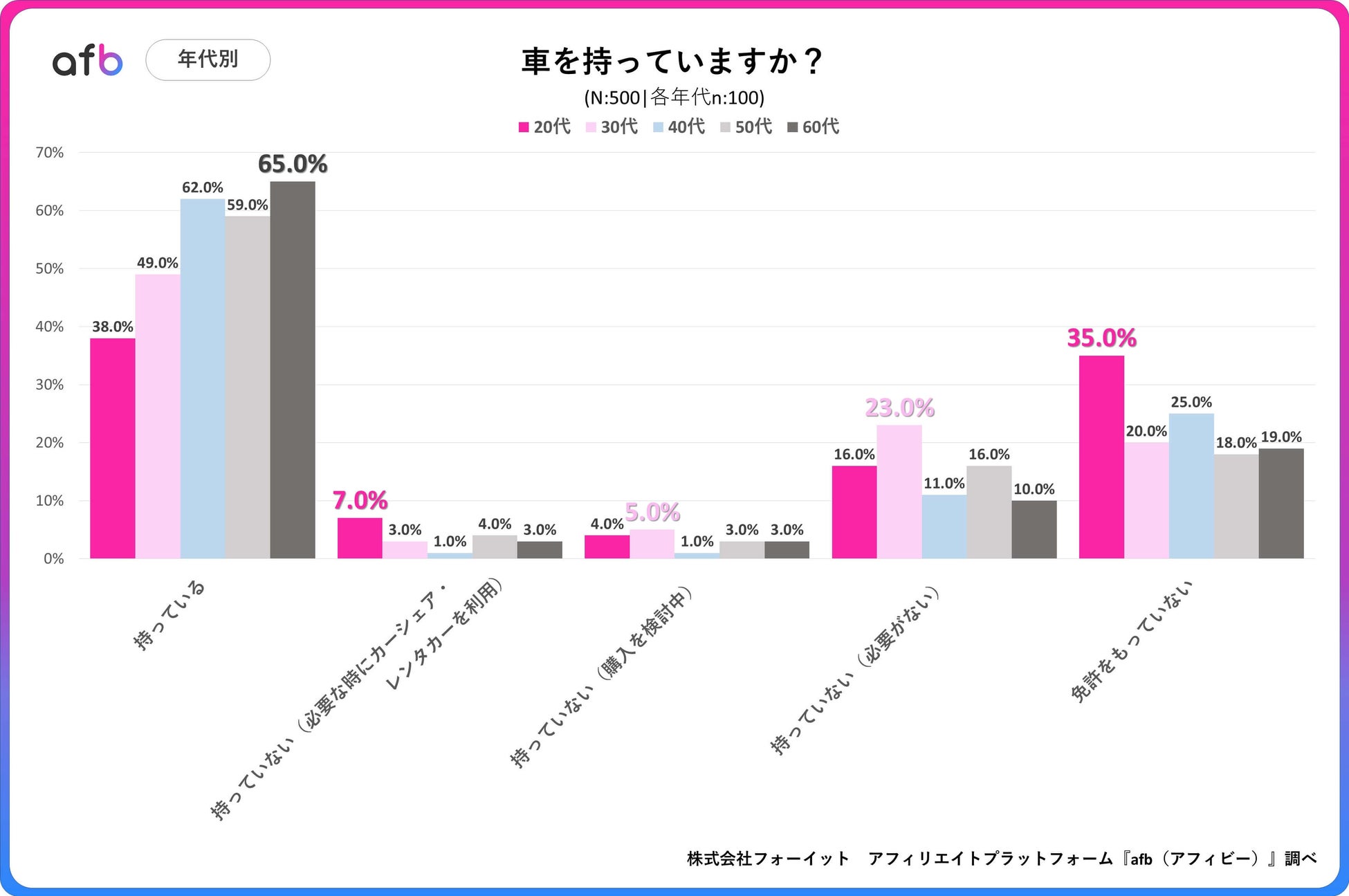 アフィリエイトプラットフォーム「afb(アフィビー)」< https://www.afi-b.com/ >の開発運用をおこなう株式会社フォーイットは、全国の20代~60代までの男女500人を対象に暮らしに関するアンケートを実施し、年代別等の特徴についてまとめました。