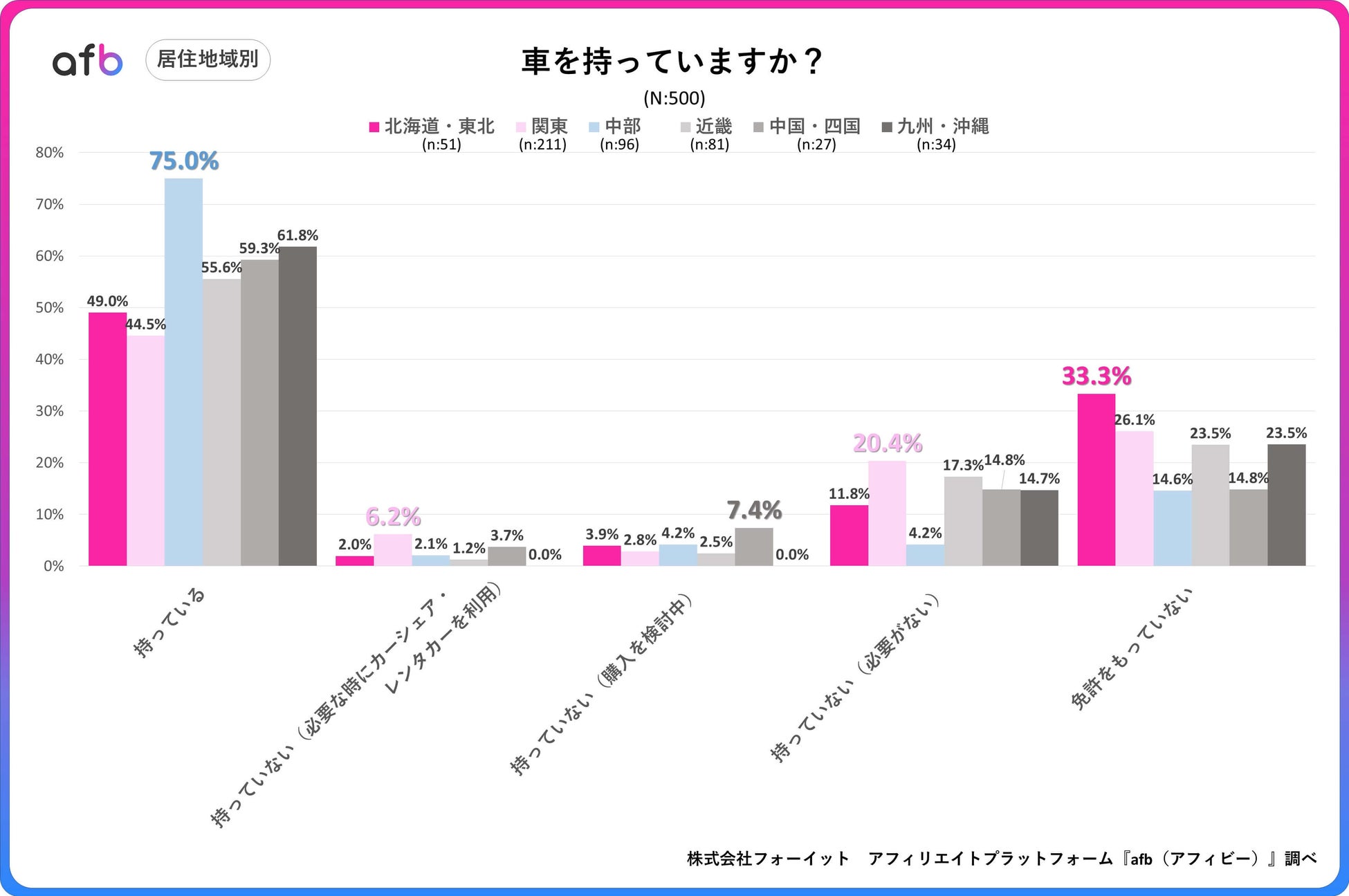 居住地域別で見ると、車を持っている方が最も多い地域は中部で、75%に上りました。次いで、近畿や中国・四国、九州・沖縄が60%前後で続き、北海道・東北と関東は50%未満に留まるという結果でした。関東の場合は、特に首都圏において公共交通機関が著しく発達しているため、車を持っていなくても支障がないことから所有率が低くなっていると考えられます。また、都市部の駐車場費用は高額なため、所有した場合の維持費が高くなってしまうことも、所有率の低さに影響している可能性が伺えました。北海道は人口の約40%が札幌市に集中しているため、車を必要としない方が一定数おり所有率が押し下げられているのかもしれません。
