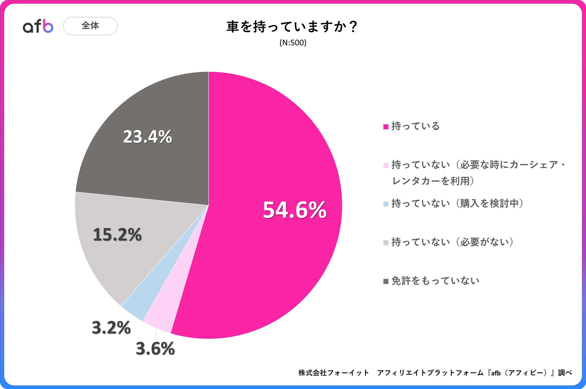 全国の20代〜60代の男女を対象に、「車を持っていますか?」というアンケートを実施したところ、「持っている」と回答した方は54.6%でした。「持っていない」と回答した方は22%で、必要なときにカーシェア・レンタカーを利用する方が3.2%、購入を検討中の方が3.6%、必要がないという方が15.2%という結果になりました。また、「免許を持っていない」は23.4%でした。