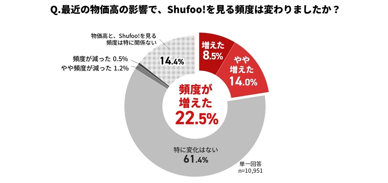 一方で「特に変化はない」が61.4%と最多で、「物価高と、Shufoo!を見る頻度は特に関係ない」も14.4%ありました。しかし、もともと買い物情報に敏感な層でも約5人に1人が行動変化を起こしていることは、消費者の節約意識の高まりが確実に行動変化として現れていることを示しています。